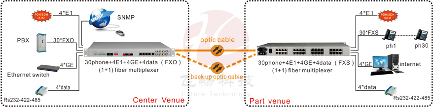 This series of telephone Optical device provides 30 channels of phone 1 to 4 E1 interface, 4 10/100 / 1000M Gigabit Ethernet interface (wire speed 1000M), as well as four business expansion interface. 4 port Ethernet interface switching, VLAN support division. 4 Extended service interface can be used as RS232 / RS485 / RS422 asynchronous data, voice signal, twenty-four wire E & M audio signals, digital signals, transmission channel, the application is very flexible.