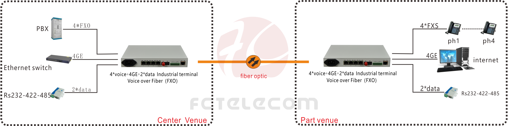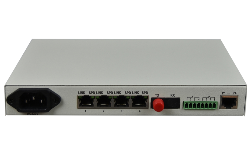 The Equipment supports 4*1000M Ethernet +4*Voice+ 2*RS232/422/485/Dry contact  interface to the optical fiber converter, to achieve network + telephone + serial data + Dry contact 4 type interface in the same core Optical fiber transmission, is widely used in a variety of industrial control, card, instrumentation and other occasions, not only save fiber resources, but also save fiber equipment, reduce the point of failure, to facilitate the maintenance of equipment. 4*1000M Ethernet interface bandwidth for the wire speed 1000M.