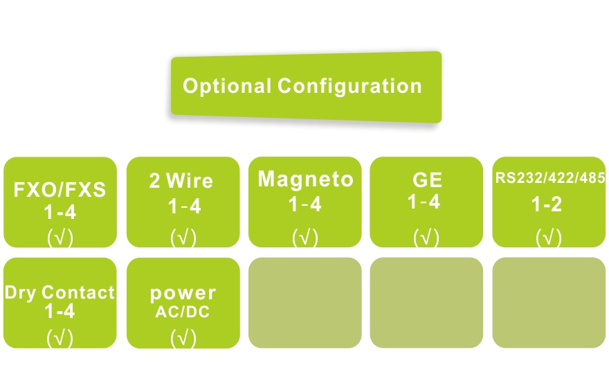 ◆ Voice port support FXO/FXS/2 Wire Audio/Magnet phone interface, FXO port plug into PBX,  FXS port is connected to the user's telephone;