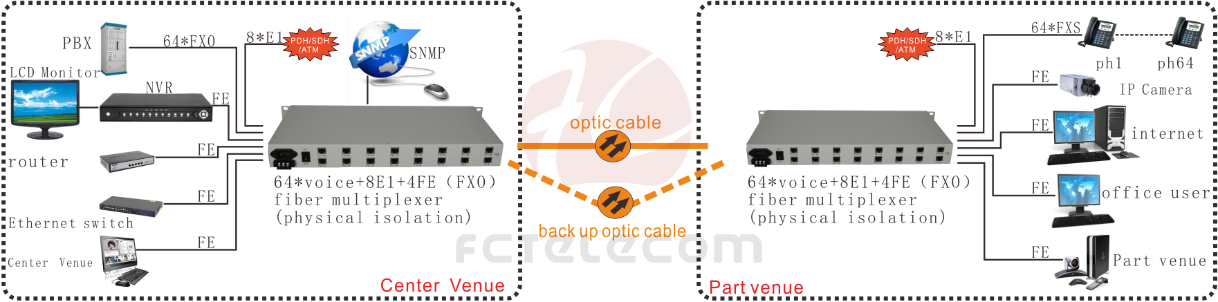 Fiber-64Voice + 8E1 +4*FE( Physical Isolation) Multiplexe