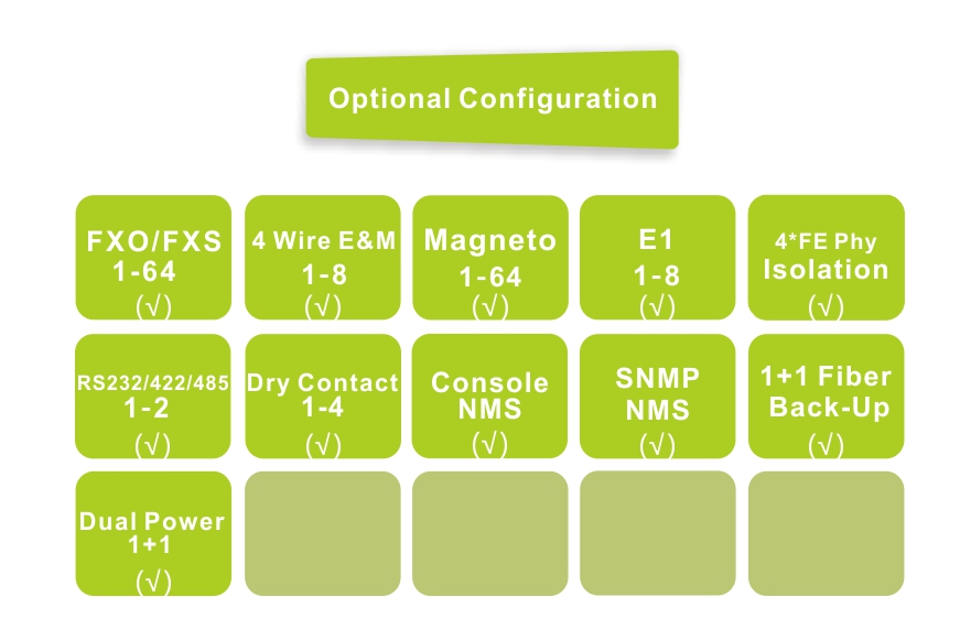 ◆   Voice port to support FXO/FXS/2-4 Wire E&M/2-4 wire Audio/Magnet phone interfaceFXO port plug into PBXFXS port is connected to the user's telephone;