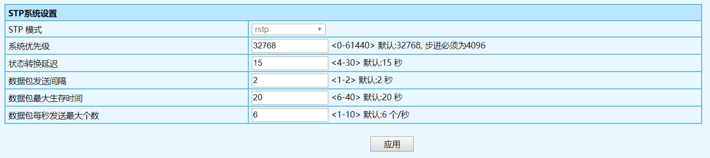 | STP 模式 | 當前的 STP 模式,支持 RSTP,兼容 STP |