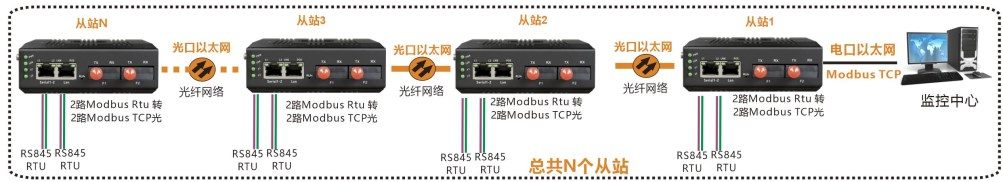 可光纖級連型 2 路 RS232/422/485 串口服務器,2 路光以太+1 路電以太,工業(yè)軌式