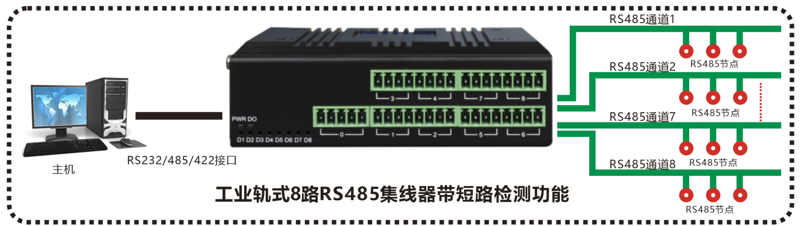 產(chǎn)品功能描述 工業(yè)軌式 8路RS485集線器(帶短路檢測(cè)并隔離功能)