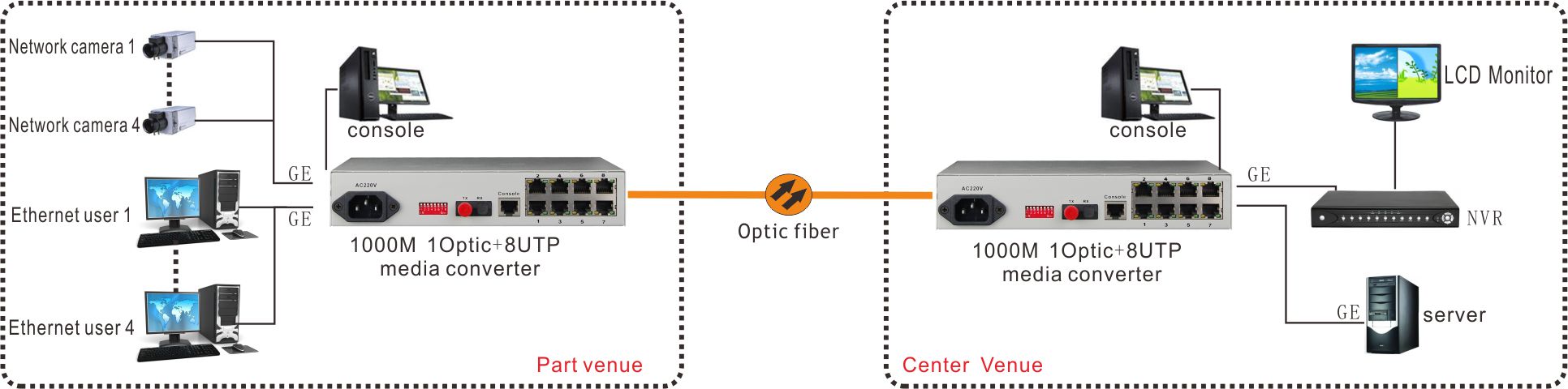 This series is IEEE802.3 Ethernet media converter 10/100/1000M twisted pair to 1000base-X fiber media is mainly used for long-distance fiber-optic network (20/40/60/80/100 km) transmission. This product provides one gigabit optical port; 8 Gigabit Ethernet port and shared gigabit bandwidth the bandwidth of each channel can be set via the Console port (Ethernet interface switching port can support VLAN classification) namely logical isolation; a Console port. With a sound alarm function the whole stable reliable low power consumption high integration small size