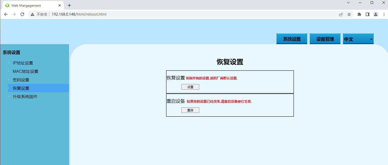 | 恢復出廠設置 | 單擊此按鈕,設備將失去所有現(xiàn)有配置,恢復為出廠配置。 |
