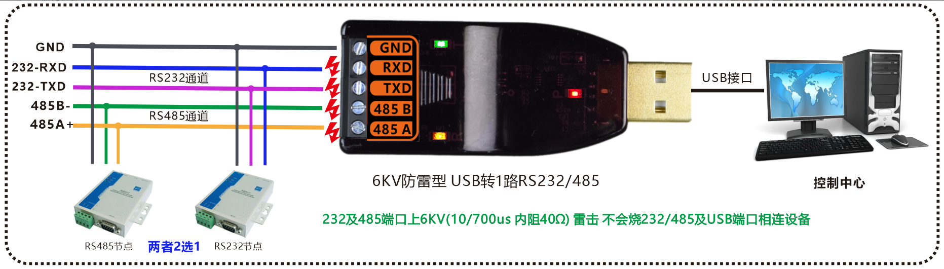 工業(yè)級(jí) 6KV防雷型 USB轉(zhuǎn)1路RS232/485轉(zhuǎn)換器