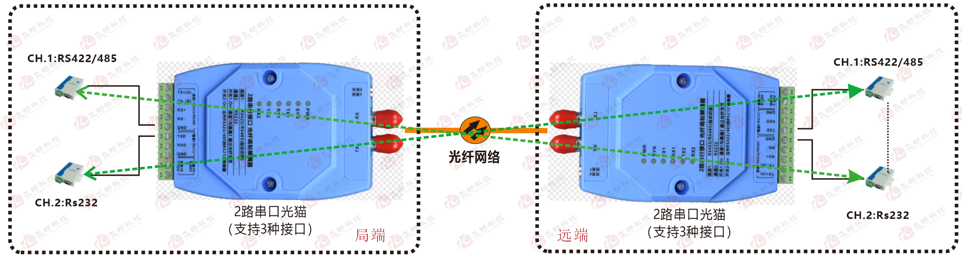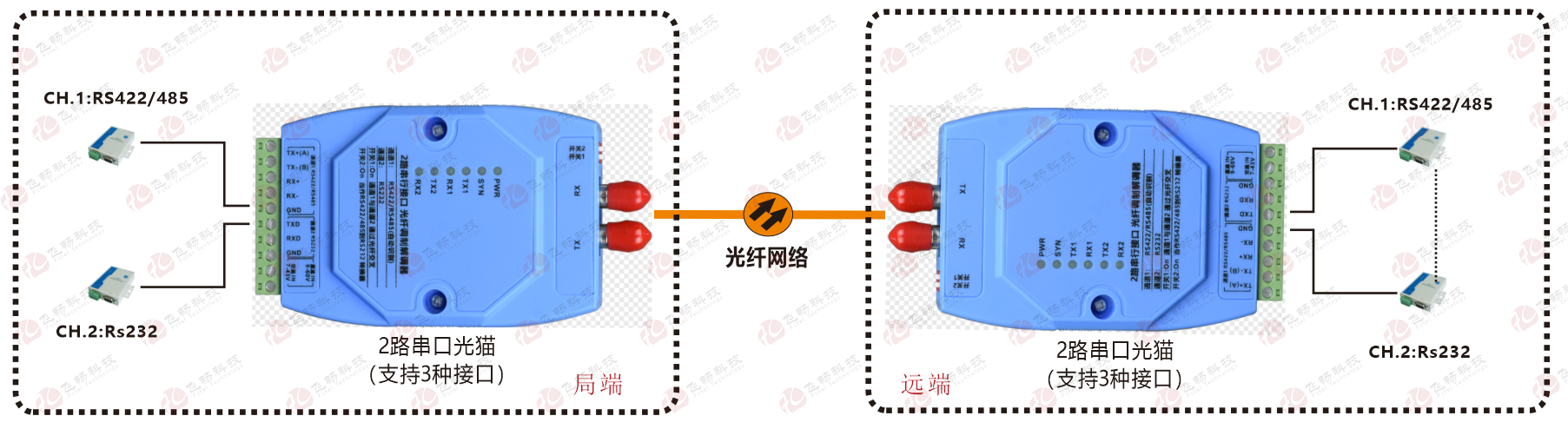 案例一:常規(guī)應用,當作2路串口光貓應用,第1路RS422/485第2路RS232